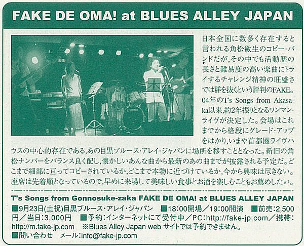 「T’s songs from GONNOSUKEZAKA 2006 〜FAKE de OMA!〜」ライブの紹介記事が掲載されました。