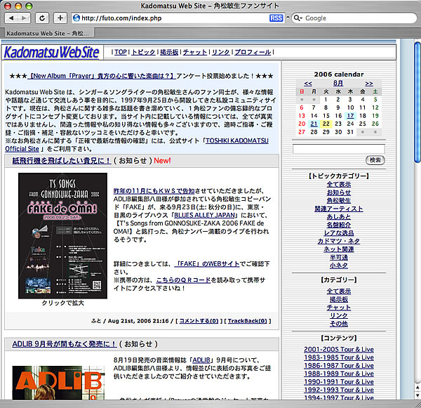 角松敏生私設ファンサイトの今や大御所、Kadomatsu Web Siteにて「T’s Songs from GONNOSUKE-ZAKA 2006 FAKE de OMA!」ライブを紹介いただきました。